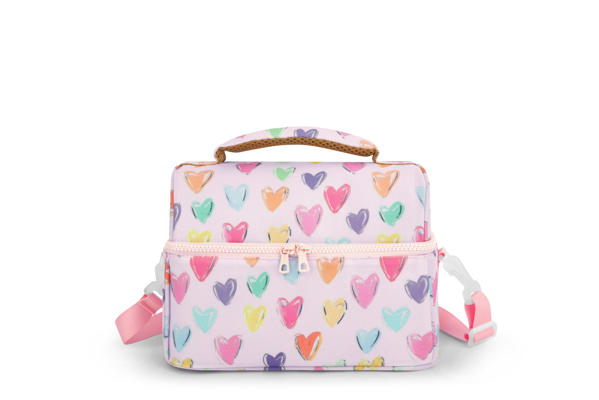 Confeccionada en una tela resistente y 100% lavable esta lonchera ofrece un amplio espacio interior, diseñada en forma de baúl con tapa para permitir un acceso total a todo el contenido. Equipada con un cierre doble de plástico. El interior aislante ayuda a mantener la comida caliente o fría. Además, cuenta con un compartimento en la parte interna de la tapa con malla, perfecto para organizar objetos más pequeños, utensilios o servilletas. La lonchera se puede transportar del asa acolchada en la parte superior o colgada en el hombro con la correa ajustable.